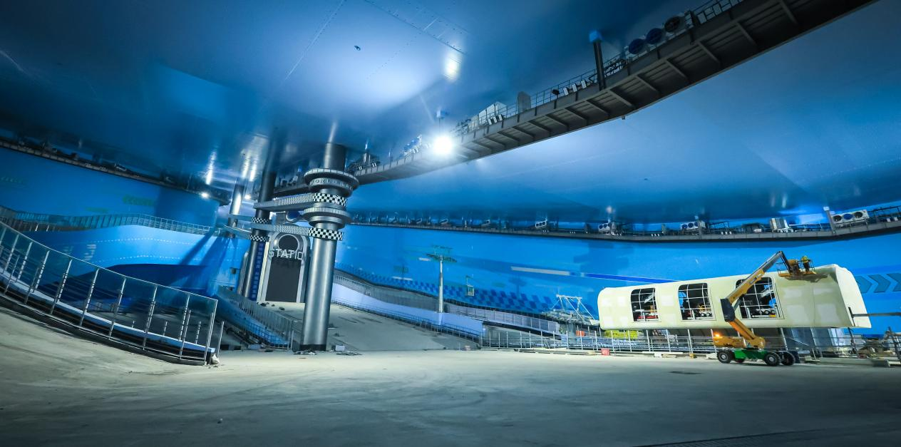 盡管室內滑雪場仍在施工中,但嶄新的雪具大廳已經(jīng)進入裝修的最后階段,分布在墻上和頂棚的藍色光帶營造的雪花造型,給人以強烈的視覺沖擊。進入到滑雪場內部,四條不同等級的雪道顯露真容,拖掛式纜車的核心設備已安裝到位,空中纜線基本鋪設完成。
