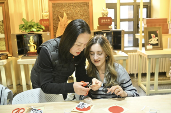 美國自媒體博主于中美按照吉林省查干湖魚皮制作技藝傳承人徐毳的指導(dǎo),一步步剪完了魚皮畫,她舉著自己的作品說:“我是第一次了解魚皮畫,沒想到魚皮能做成這么精美、這么美麗的藝術(shù)品。”