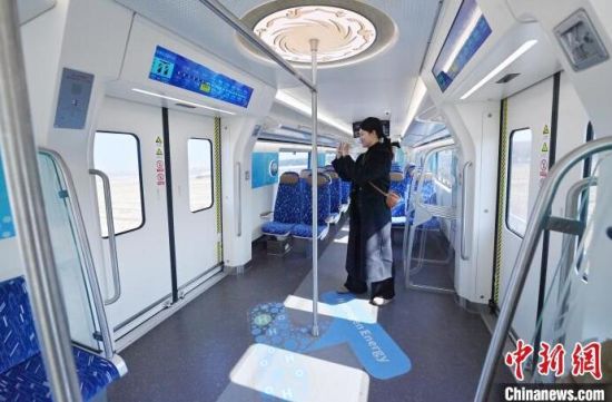3月21日,全球首列氫能源市域列車在長(zhǎng)春進(jìn)行時(shí)速160公里滿載運(yùn)行試驗(yàn)。圖為列車車廂內(nèi)部。中新社記者 張瑤 攝