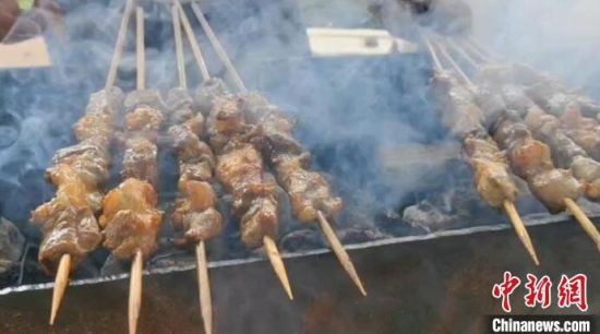 活動現(xiàn)場,多種新鮮食材在炭火的炙烤下散發(fā)出陣陣香氣。除了傳統(tǒng)的烤肉串之外,還有烤全羊、烤河蚌、烤鯽魚等菜品。