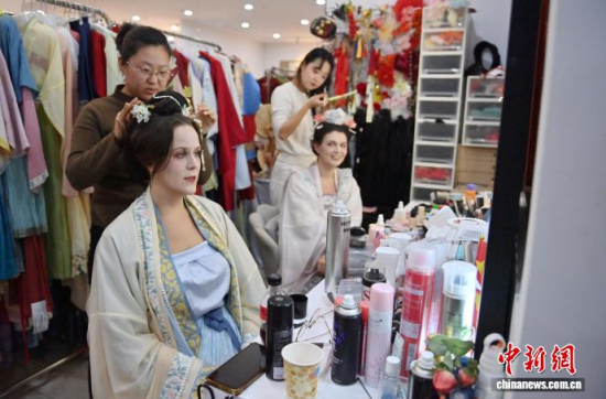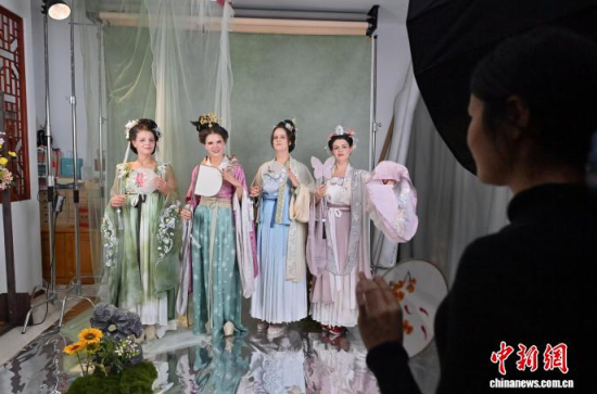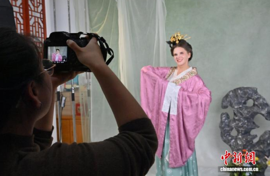 11月9日,在吉林長春的一家漢服體驗館,德國友人身著精美漢服拍攝寫真。近年來,漢服日益受到外籍人士青睞。該館已為超百名外籍人士提供漢服體驗和拍攝服務(wù),讓他們在沉浸式拍攝中,了解中國傳統(tǒng)文化。中新社記者 張瑤 攝