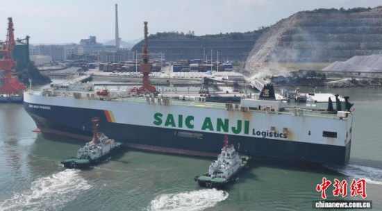 中新網(wǎng)寧德10月27日電 (范正雄)27日上午,裝載著上汽寧德基地生產(chǎn)的991輛名爵汽車的大型滾裝船“上汽安吉鳳凰”輪,在位于福建省寧德市的寧德口岸漳灣寧連碼頭7號(hào)泊位出港,將航行至連云港,繼續(xù)裝車后駛往沙特阿拉伯。