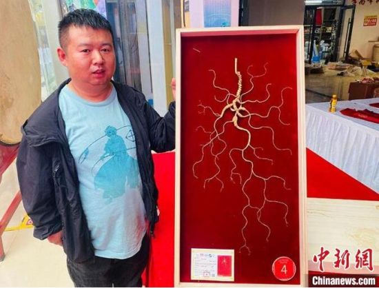 據(jù)了解,脫穎而出的“野山參王(干品)”有著百年參齡,主人是來自吉林省白山市的參商張雯溥!斑@次帶來的野山參五形特別好,皮老紋深,參須柔韌性強(qiáng),有彈性,蘆、紋、體、皮色、須可以說都屬上乘!