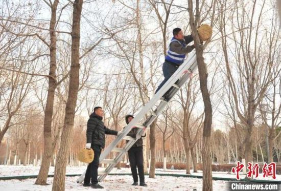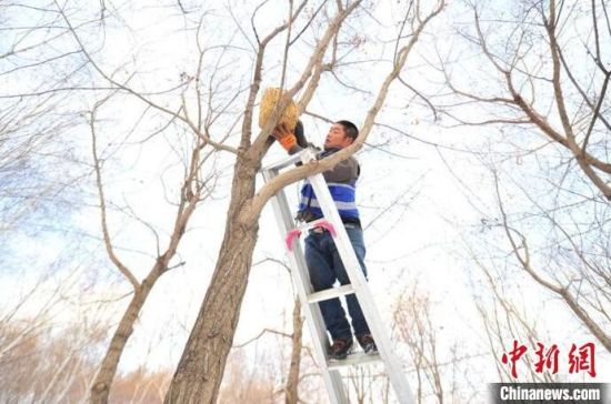 11月23日,趁著雪后天晴,吉林長春友誼公園的工作人員忙著維護樹上的草編鳥巢,并投放了鳥糧。該公園生態(tài)環(huán)境好、野生鳥類多,園方已經(jīng)連續(xù)三年在園區(qū)設(shè)置百余個草編鳥巢助鳥類安全過冬。