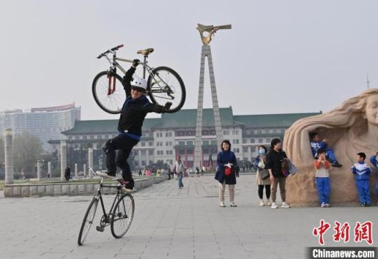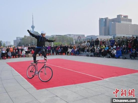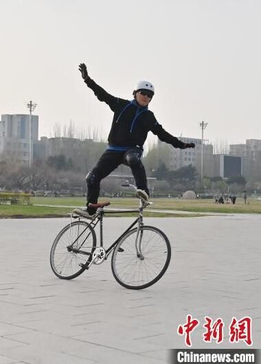 4月24日,在長春市文化廣場內,64歲的市民周長春表演自行車花樣絕技。站立騎行、脫把騎行等一系列驚險刺激的動作被周長春完成得十分精彩,吸引市民圍觀。