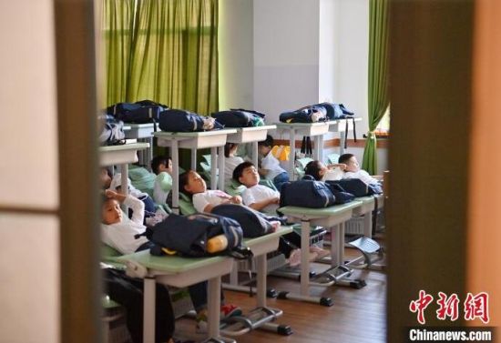 9月5日,在長春南湖實驗中海小學(xué),學(xué)生們在“可躺式”課桌椅上午睡。目前,吉林省有多所學(xué)校已啟用“可躺式”課桌椅,學(xué)生們中午可以躺著休息。中新社記者 張瑤 攝