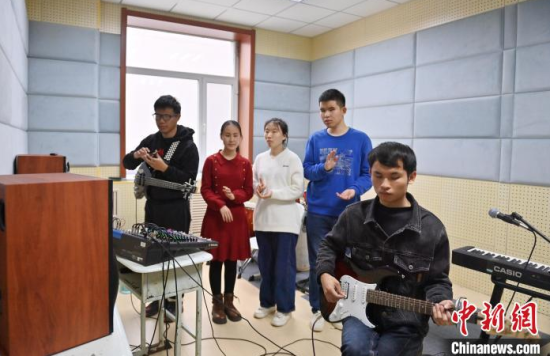 11月14日,吉林長(zhǎng)春,“逐暗逐光”樂(lè)隊(duì)成員在交流排練細(xì)節(jié)。長(zhǎng)春大學(xué)特教學(xué)院有一支名叫“逐暗逐光”的樂(lè)隊(duì),樂(lè)隊(duì)成員都是視障學(xué)生。他們因音樂(lè)相聚在一起,用音樂(lè)去驅(qū)逐黑暗追逐光明。中新社記者 張瑤 攝