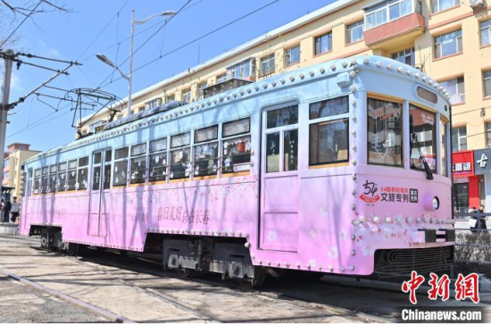 4月18日,吉林長(zhǎng)春,游客在54路文旅春日限定專(zhuān)列上拍照留念。該專(zhuān)列車(chē)廂內(nèi)外融入了桃花的設(shè)計(jì)元素,營(yíng)造出濃郁的春意,吸引了眾多游客前來(lái)打卡。中新社記者 張瑤 攝