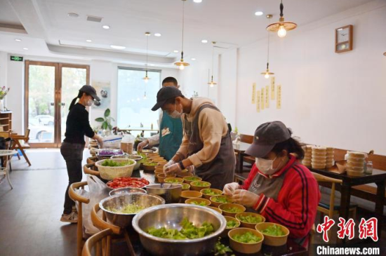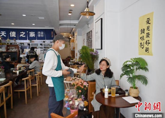 5月8日,吉林長春,“天使之家”餐飲店的店員在收拾餐桌。這里的部分工作人員是孤獨(dú)癥患者,這家店旨在助力青年孤獨(dú)癥群體就業(yè),融入社會(huì)。他們通過訓(xùn)練,已經(jīng)可以完成切菜、備餐、收拾店內(nèi)衛(wèi)生、撤餐等工作。中新社記者 張瑤 攝