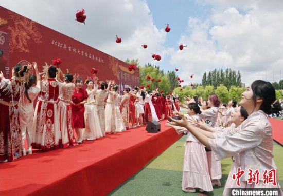 6月21日,吉林大學(xué)中心校區(qū)舉行2025年校友集體婚禮,36對新人從四面八方相聚在母校,在眾人矚目下有序步入婚禮主舞臺,沿途得到學(xué)弟學(xué)妹們的熱情祝福。中新社記者 張瑤 攝